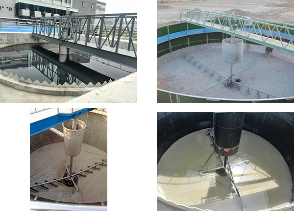 中心傳動刮吸泥機采用中心傳動,污水從進水管流入導流筒擴散后,均勻的向周邊呈輻射狀流出,呈懸浮狀的污泥經(jīng)沉淀后沉積于池底,驅(qū)動裝置帶動中心豎架旋轉(zhuǎn),并帶動刮臂及刮泥板轉(zhuǎn)動,刮泥板將污泥刮集后由吸泥管靠池內(nèi)靜水壓抽吸至中心泥缸,再通過中心排泥管排出池外,水面上的浮渣通過旋轉(zhuǎn)撇渣裝置導入排渣斗內(nèi)排出池外;而上清液則通過三角形出水堰板溢入出水槽內(nèi)排出。我公司將會針對用戶不同工藝控制條件要求,做相應(yīng)的配套調(diào)整設(shè)計,以確保泥漿沉降分離和洗滌效果,減少浪費,節(jié)約投資成本。