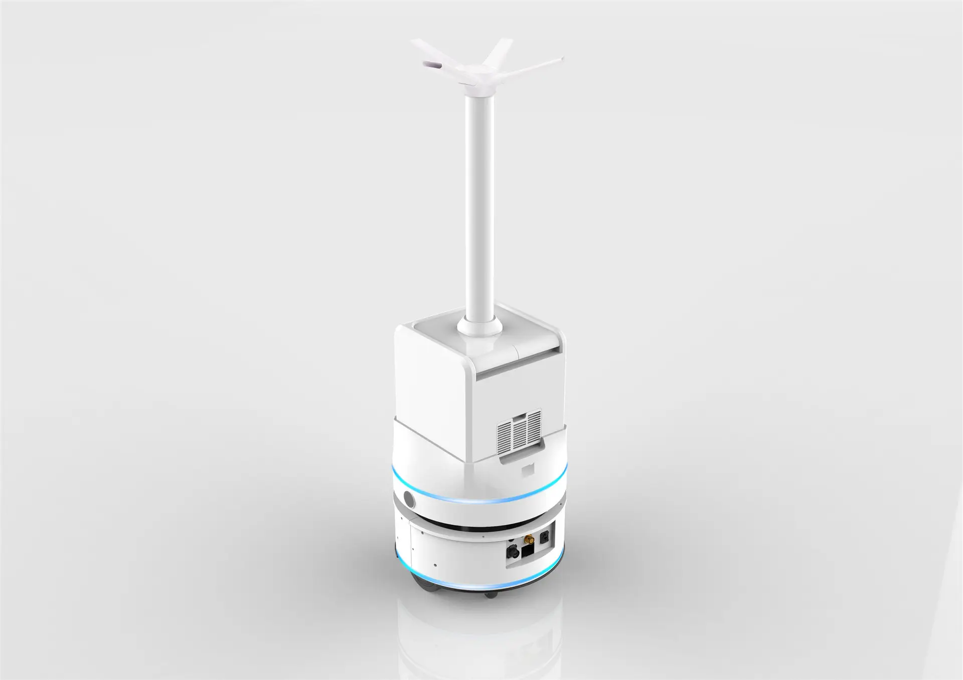 消毒防疫機(jī)器人簡稱消毒機(jī)器人,機(jī)器人為載體,在機(jī)器人內(nèi)部裝置消毒系統(tǒng),有霧化消毒機(jī)器人、紫外線消毒機(jī)器人、等離子消毒機(jī)器人、強(qiáng)光脈沖消毒機(jī)器人等。其中霧化消毒機(jī)器人應(yīng)用最為普遍,霧化消毒機(jī)器人是將消毒霧化,產(chǎn)生消毒氣體,利用機(jī)器人的氣動系統(tǒng)將消毒氣體快速的在室內(nèi)空間擴(kuò)散,增加消毒的覆蓋面和均勻性,能有效、無死角地殺滅空氣中的致病微生物,消毒機(jī)器人能夠根據(jù)設(shè)定的路線自動、高效、精準(zhǔn)的對室內(nèi)進(jìn)行消毒防疫。